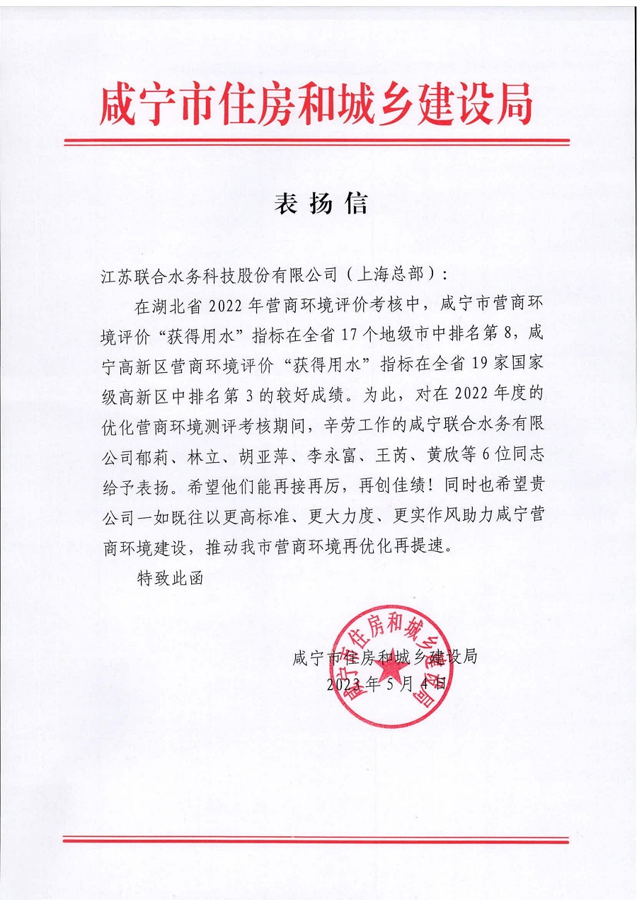 近日,湖北省咸寧市住房和城鄉(xiāng)建設(shè)局向聯(lián)合水務(wù)發(fā)來(lái)一封表?yè)P(yáng)信,對(duì)江蘇聯(lián)合水務(wù)科技股份有限公司旗下全資子公司咸寧聯(lián)合水務(wù)有限公司2022年度優(yōu)秀營(yíng)商環(huán)境小組成員進(jìn)行通報(bào)表?yè)P(yáng),他們分別是客戶(hù)服務(wù)副總經(jīng)理郁莉、客戶(hù)服務(wù)部經(jīng)理林立、市場(chǎng)拓展部副經(jīng)理胡亞萍、客戶(hù)服務(wù)部抄收主管李永富、市場(chǎng)拓展部市場(chǎng)專(zhuān)員王芮、行政管理部行政助理黃欣。此次通報(bào)表?yè)P(yáng),彰顯了湖北省咸寧市住建局對(duì)聯(lián)合水務(wù)履行企業(yè)責(zé)任、助力咸寧市營(yíng)商環(huán)境建設(shè)的充分肯定與高度贊揚(yáng)。