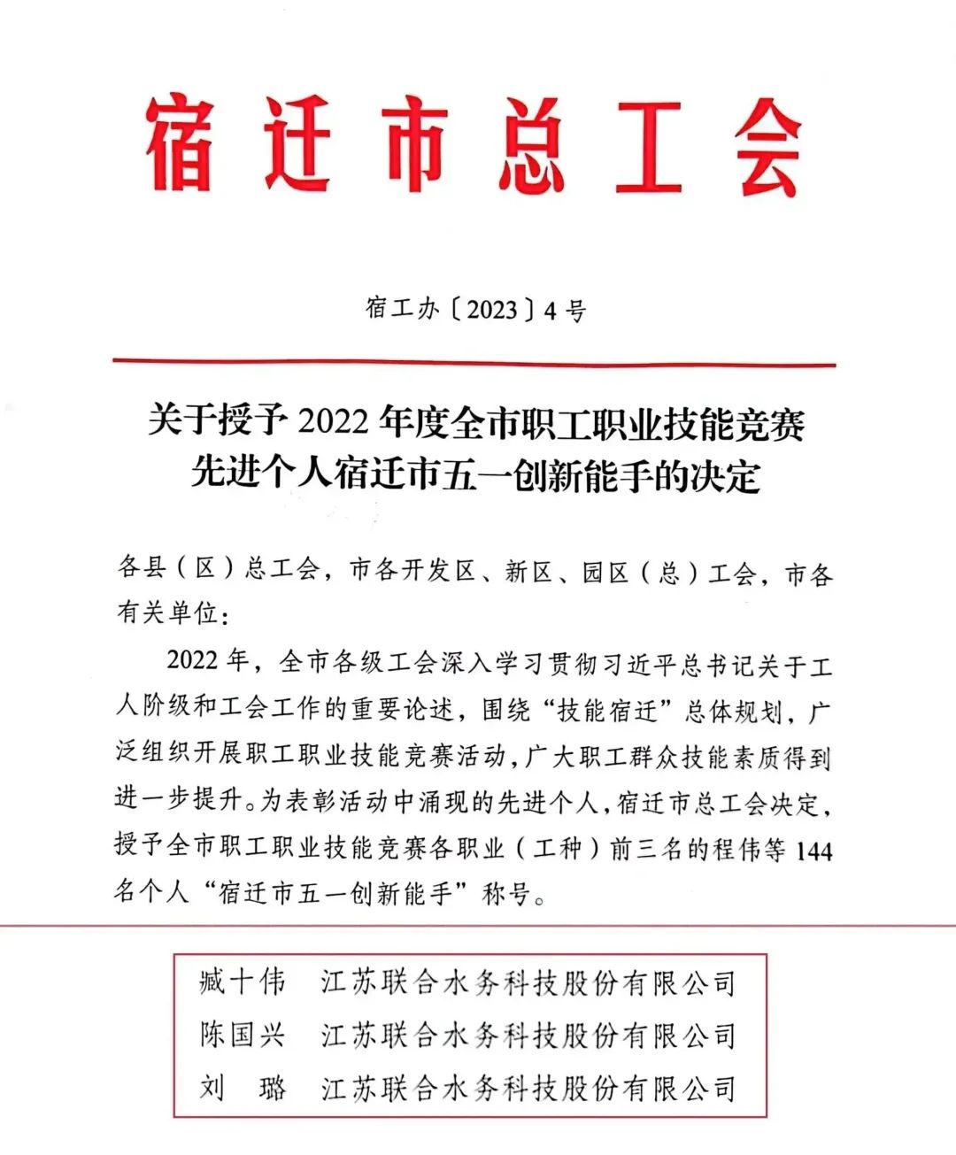 | 喜報!這些聯(lián)合水務人榮獲宿遷市“五一勞動獎章”和“五一創(chuàng)新能手”榮譽稱號! | ||
