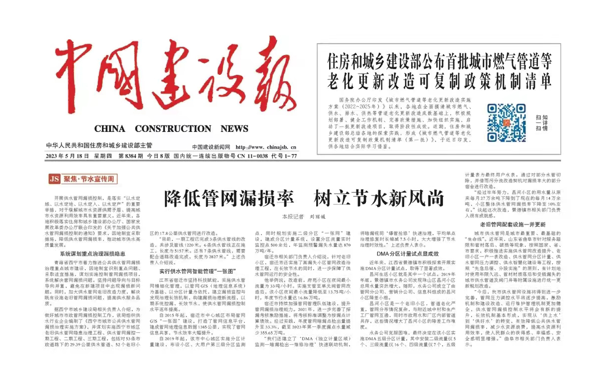 5月18日,中國(guó)建設(shè)報(bào)針對(duì)聯(lián)合水務(wù)的供水管網(wǎng)建設(shè),發(fā)布了“降低管網(wǎng)漏損率,樹立節(jié)水新風(fēng)尚”為題的相關(guān)報(bào)道。該報(bào)道從GIS“一張圖”、分區(qū)“一張網(wǎng)”和快速聯(lián)動(dòng)機(jī)制等多個(gè)方面,概述了公司為降低供水管網(wǎng)漏損做出的努力。降低供水管網(wǎng)漏損對(duì)于提高水資源利用效率,保障城區(qū)安全穩(wěn)定供水具有重要意義。公司在中心城區(qū)實(shí)施管網(wǎng)精細(xì)化管理,以管網(wǎng)GIS為基礎(chǔ),做好DMA分區(qū)計(jì)量和壓力管理工作,制訂內(nèi)控標(biāo)準(zhǔn),提高搶維修速度與質(zhì)量,建立“DMA分區(qū)計(jì)量監(jiān)控-漏點(diǎn)檢出-修復(fù)治理”的快速聯(lián)動(dòng)機(jī)制,不斷提高漏損治理的水平,實(shí)現(xiàn)系統(tǒng)控漏、長(zhǎng)效節(jié)水,為宿遷的安全供水提供可靠保障,勇?lián)?zé)任,守護(hù)城市供水的“生命線”。