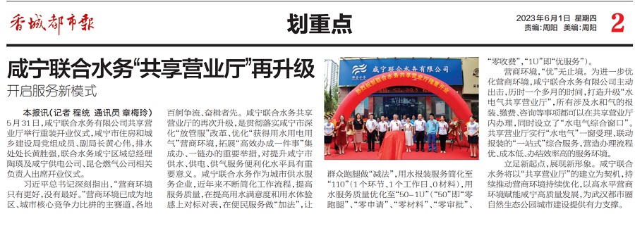 5月31日,咸寧聯(lián)合水務(wù)有限公司共享營業(yè)廳舉行重裝開業(yè)儀式,咸寧市住房和城鄉(xiāng)建設(shè)局黨組成員、副局長黃心偉、排水處處長黃勝強(qiáng)、聯(lián)合水務(wù)咸寧區(qū)域總經(jīng)理陶瑛及咸寧供電公司、昆侖燃?xì)夤鞠嚓P(guān)負(fù)責(zé)人出席開業(yè)儀式。