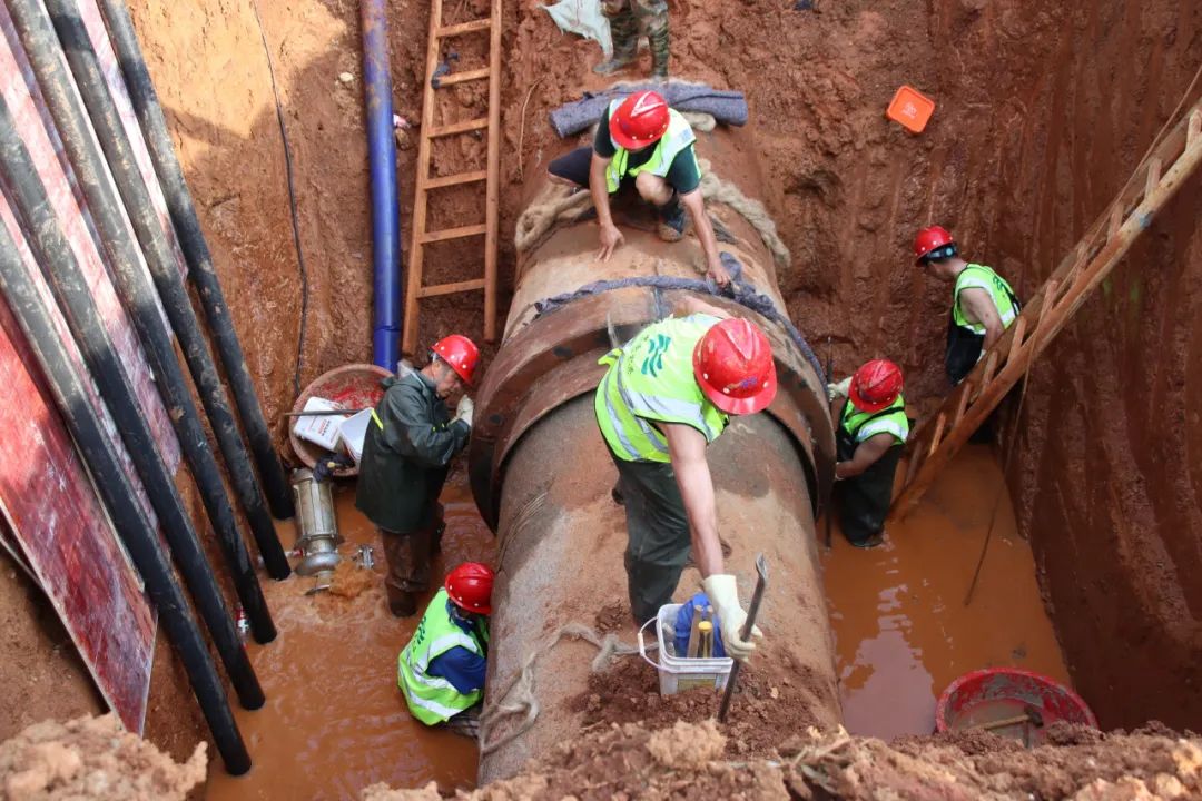 無(wú)懼“高”溫,做好應(yīng)急搶修 夏季作為一年之中的用水高峰期,季節(jié)的特殊性使得管道爆管、漏水現(xiàn)象發(fā)生頻率較高,供水管道搶修量比其他時(shí)間段明顯增加。7月12日,通江大道大屋吳附近DN1200mm供水管網(wǎng)因老化發(fā)生漏水,咸寧聯(lián)合水務(wù)多部門聯(lián)動(dòng)火速趕赴現(xiàn)場(chǎng)了解情況,并迅速啟動(dòng)應(yīng)急搶修預(yù)案,第一時(shí)間緊急調(diào)配挖掘機(jī)、發(fā)電車、抽水機(jī)等大型搶修機(jī)具進(jìn)行增援,安排應(yīng)急搶修專班趕往事發(fā)現(xiàn)場(chǎng),迅速開展現(xiàn)場(chǎng)勘察、確定漏點(diǎn)具體情況、設(shè)立全面安全防護(hù)措施等搶修前期工作。在搶修期間,面對(duì)管徑大、時(shí)間緊、施工作業(yè)環(huán)境復(fù)雜等諸多難題,搶修人員齊心配合、攻堅(jiān)克難,井然有序地開展漏點(diǎn)測(cè)定、降水開挖、焊接維修、沖洗試壓等一系列搶修和恢復(fù)工作,天氣炎熱,施工人員早已汗流浹背,但他們不畏艱難酷暑,堅(jiān)守崗位,歷經(jīng)三十六個(gè)小時(shí)的晝夜奮戰(zhàn),完美完成DN1200主管道的維修和保養(yǎng),未對(duì)城區(qū)供水造成任何不良影響。