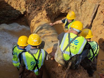 不懼“烤”驗(yàn),隨時(shí)出擊。7月5日,永安大道DN600主管道突發(fā)爆管,咸寧思源水務(wù)接到報(bào)修電話,立即組織人員趕赴現(xiàn)場,爭分奪秒開展管網(wǎng)搶修作業(yè)。搶修人員第一時(shí)間設(shè)置安全警示標(biāo)識(shí),在確定好漏點(diǎn)位置、做好現(xiàn)場保護(hù)、關(guān)閥停水后,頂著36℃高溫,有條不紊展開搶修工作。經(jīng)過抽水、挖掘、清理,管道破損位置露出水面。在狹長窄小的管溝中作業(yè),轉(zhuǎn)身接零部件都得小心翼翼,搶修人員身上的衣服濕了干、干了濕,似火的烈日曬得他們皮膚滾燙,藿香正氣水的刺鼻味道充斥在他們的胸腔,有人笑稱:“藿香正氣水都喝飽了。”哪怕在這樣的工作環(huán)境下,他們也沒有一個(gè)人抱怨,沒有一個(gè)人偷懶,用八多個(gè)小時(shí)的堅(jiān)守?fù)Q來了居民在炎炎夏日里的用水安全。