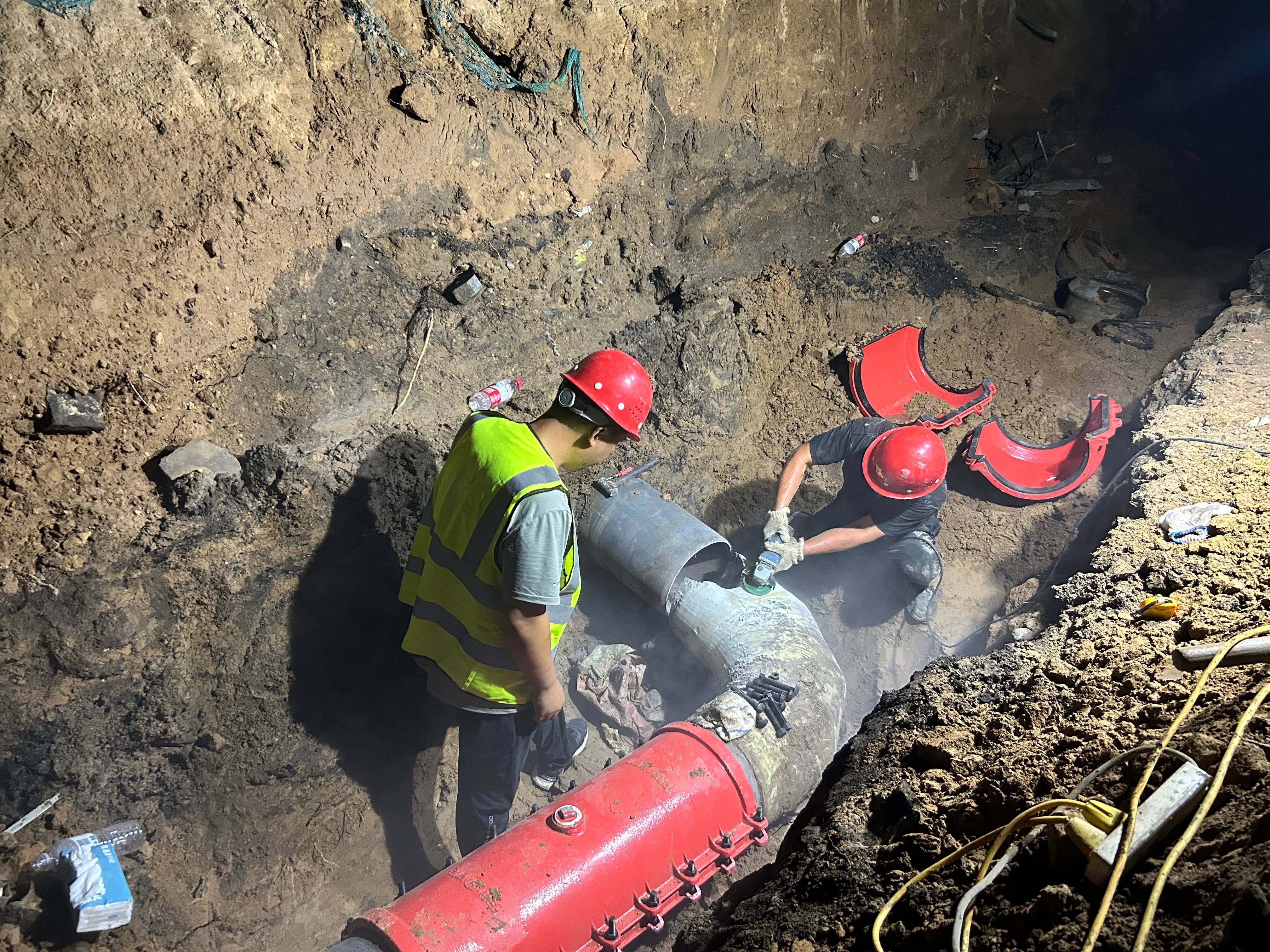 搶修隊抵達(dá)現(xiàn)場后,立即隊斷裂管道進(jìn)行了全面勘查,本次受損管道共斷裂兩處,均位于拐角處。同時,因管道老舊且受之前施工影響,給搶修作業(yè)帶來極大困難。在確保安全的前提下,制定了科學(xué)合理的搶修方案,力求在保證質(zhì)量的同時,最大限度縮短修復(fù)時間。同時,通過官方渠道發(fā)布停水通知,告知市民具體原因及預(yù)計恢復(fù)時間,穩(wěn)定社會情緒,減少不必要的恐慌。
