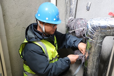 他是維修員張棟棟。背著沉重的工具包,他穿梭在大街小巷,寒風(fēng)凜冽,腳步不歇,在狹小的管道井、在沒有電梯的樓梯間……他細(xì)致地檢查管道,包裹保溫材料,用腳步丈量責(zé)任,以實(shí)干詮釋擔(dān)當(dāng)!懊恳粚拥乃硐,我們都要對保溫棉、表套等進(jìn)行檢查,并做好記錄。遇到雨雪冰凍天氣,我們還會(huì)增派人員,加大巡檢力度。”寒潮來臨前,公司全體維修員不畏嚴(yán)寒,爭分奪秒,對小區(qū)管道井、水表箱進(jìn)行全面檢查和維護(hù),每一處細(xì)節(jié)都不放過,一旦出現(xiàn)供水故障,他們會(huì)迅速組織人員搶修,以最快速度恢復(fù)供水。 “您好,聯(lián)合水務(wù)宿遷供水公司,您請講!