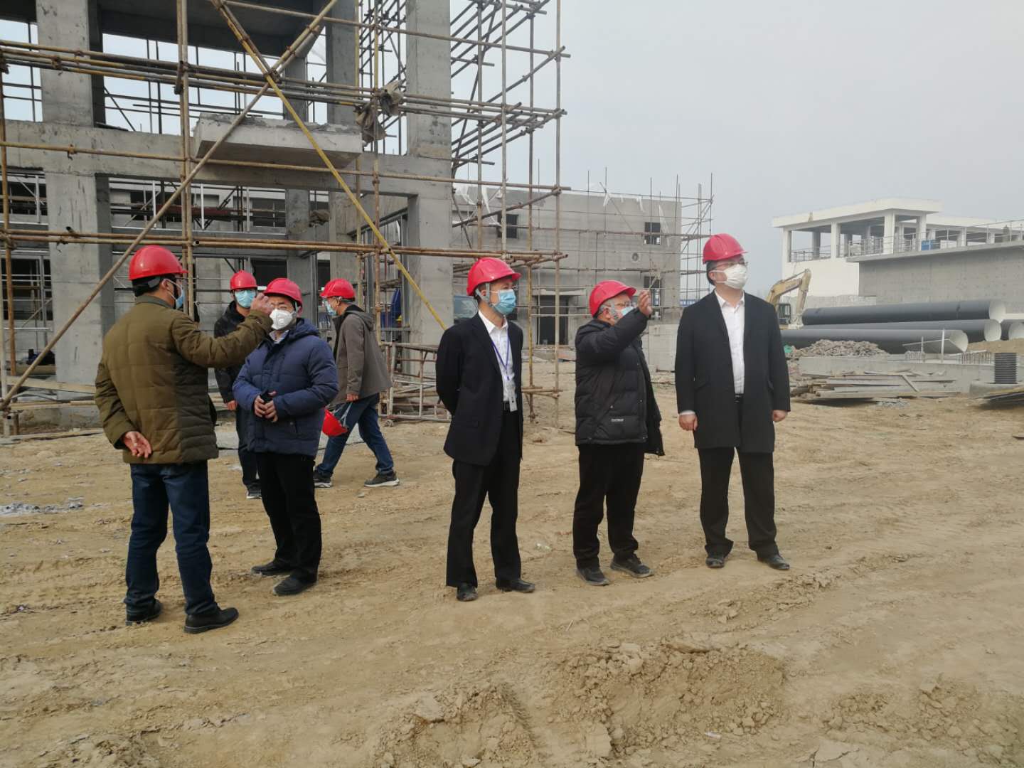 在二水廠四期擴(kuò)建工地現(xiàn)場,宿遷公司項目部經(jīng)理王冬青向劉總詳細(xì)匯報項目進(jìn)展情況:目前項目復(fù)工后各項工作有序開展,土建主體施工已基本完成,化驗值班樓正在加緊施工;工藝管道安裝正在緊張施工,工藝設(shè)備陸續(xù)到貨,整體的安裝工程已完成約50%,廠區(qū)工藝管線完成約10%;高壓配電安裝正在施工。