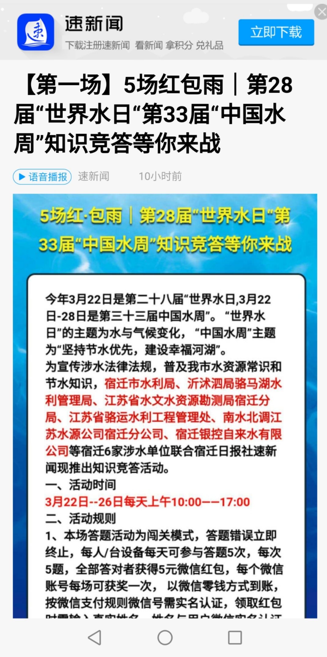 “汴水流,泗水流,流到瓜州古渡頭”。位于蘇北泗水畔的酒都宿遷以洋河美酒聞名大江南北乃至全世界。水是酒的命脈,好酒必有好水。宿遷,別稱“水城”,地處淮河、沂沭泗流域中下游,南臨洪澤湖,北接駱馬湖,著名的京杭大運(yùn)河穿境而過。在3月22日“世界水日“、3月22日—28日 “中國水周”到來之機(jī),聯(lián)合水務(wù)宿遷銀控自來水有限公司會同宿遷市水利局、沂沭泗局駱馬湖水利管理局、江蘇省水文水資源勘測局宿遷分局、南水北調(diào)江蘇水源公司宿遷分公司及宿遷日報(bào)社共同舉辦系列宣傳活動,護(hù)衛(wèi)城市命脈,傳承生態(tài)愿景。一方水土養(yǎng)一方人, 節(jié)水、護(hù)水、愛水,全員行動起來,讓水韻宿遷更加大放光彩。 受疫情影響,今年宿遷市的“世界水日”、“中國水周”宣傳活動采用線上方式扎實(shí)開展,方式新穎且力度不減。經(jīng)過前期合辦單位的用心籌劃,圍繞今年國家水利部確定的“堅(jiān)持節(jié)水優(yōu)先 建設(shè)幸福河湖”的宣傳主題,系列宣傳活動以別開生面、匠心獨(dú)具的六大方式精彩呈現(xiàn),提高全市人民節(jié)水、護(hù)水、愛水意識,形成全員參與、共創(chuàng)水生態(tài)美好家園的良好氛圍。 全民總動員開始啦!網(wǎng)絡(luò)倡議書簽名轉(zhuǎn)發(fā)活動,倡議書內(nèi)容豐富,既有宿遷市水資源知識,還有節(jié)水小竅門呢,以百姓喜聞樂見的微信群、通過微信群、微信朋友圈方式進(jìn)行轉(zhuǎn)發(fā);網(wǎng)絡(luò)答題贏紅包活動,5場“紅包雨”,第28屆“世界水日”、第33屆“中國水周”知識全民競技,寓教于樂;意見建議征集活動,保護(hù)水資源,你獻(xiàn)計(jì),他獻(xiàn)策,水更清、城更美,民更樂;網(wǎng)上攝影展活動,用鏡頭拍下最美水景,感受水鄉(xiāng)靈韻;水美文章征文活動,分享《童年的河》,一水一情,讓故鄉(xiāng)的水在心間流淌;彩印卡片+鮮花贈送活動,水法宣傳不見面,投放在銀行、商場、醫(yī)院、公園、公交站臺等公共場所,全民知法、懂法、守法,愛護(hù)水源,人人有責(zé)。宿遷銀控自來水有限公司動員公司全體員工積極參與各類活動,以實(shí)際行動支持節(jié)水、護(hù)水、愛水行動。 圖1:節(jié)水倡議書冠名單位