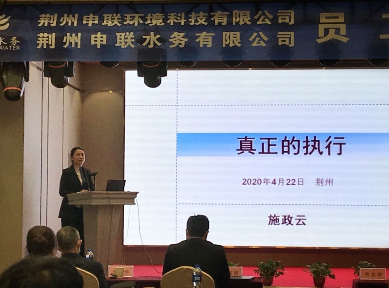 圖3:咸寧思源水務有限公司常務副總經理施政云培訓 培訓期間,人事行政副總經理劉斌宣讀了集團公司對荊州申聯(lián)公司在疫情期間的6名最美逆行者的通報表彰,并進行了現場頒獎。這6名逆行者為了保證生活污水處理廠的正常運行,舍小家顧大家,毅然決然的服從公司安排,每天24小時的封閉值守,堅守了四十多天,連續(xù)奮戰(zhàn),為保障生活污水處理設施正常運行做出了巨大貢獻,為荊州申聯(lián)公司全體員工做出了積極、正向的榜樣,同時也為荊州開發(fā)區(qū)18萬人在疫情期間的正常生活提供了有力的保障。公司各部門的三位員工代表,在培訓第一天的尾聲發(fā)表了熱情洋溢的入職感言,道出了與荊州申聯(lián)公司同進步、共發(fā)展的決心與信心。