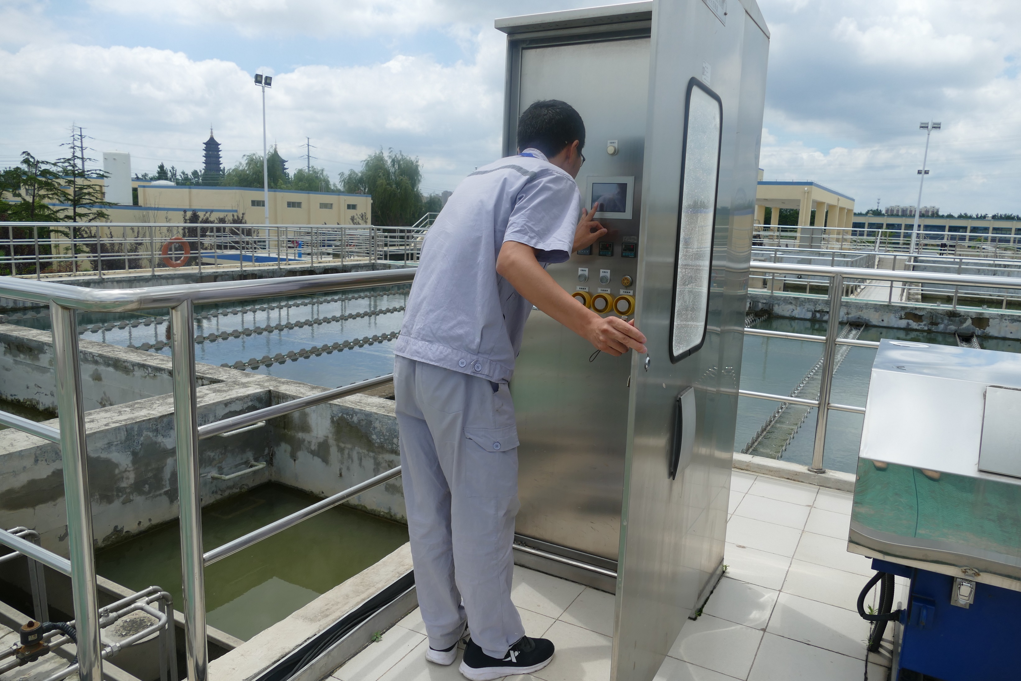 圖1:二水廠四期擴(kuò)建項(xiàng)目全景 制水部把好“安全生產(chǎn)”關(guān) 嚴(yán)格巡檢、嚴(yán)控工藝。生產(chǎn)人員每小時(shí)巡檢一次,全天候24小時(shí)不間斷,穿梭于設(shè)備間、配電間、水池等每一個(gè)角落,時(shí)刻關(guān)注運(yùn)行情況,針對(duì)沉淀、過濾、消毒等各環(huán)節(jié)工藝控制點(diǎn),遵照嚴(yán)格的內(nèi)控標(biāo)準(zhǔn)執(zhí)行。檢測(cè)合格的原水接下來還要經(jīng)過預(yù)臭氧、絮凝、沉淀、過濾、后臭氧、生物活性炭濾池、消毒等7 道處理工序,才能進(jìn)入送水泵房。生產(chǎn)人員夏季工作環(huán)境最高溫度可達(dá)35℃,他們?cè)倏嘣倮郏家獔?jiān)決保障全城百姓的用水安全,這是一份責(zé)任在肩。