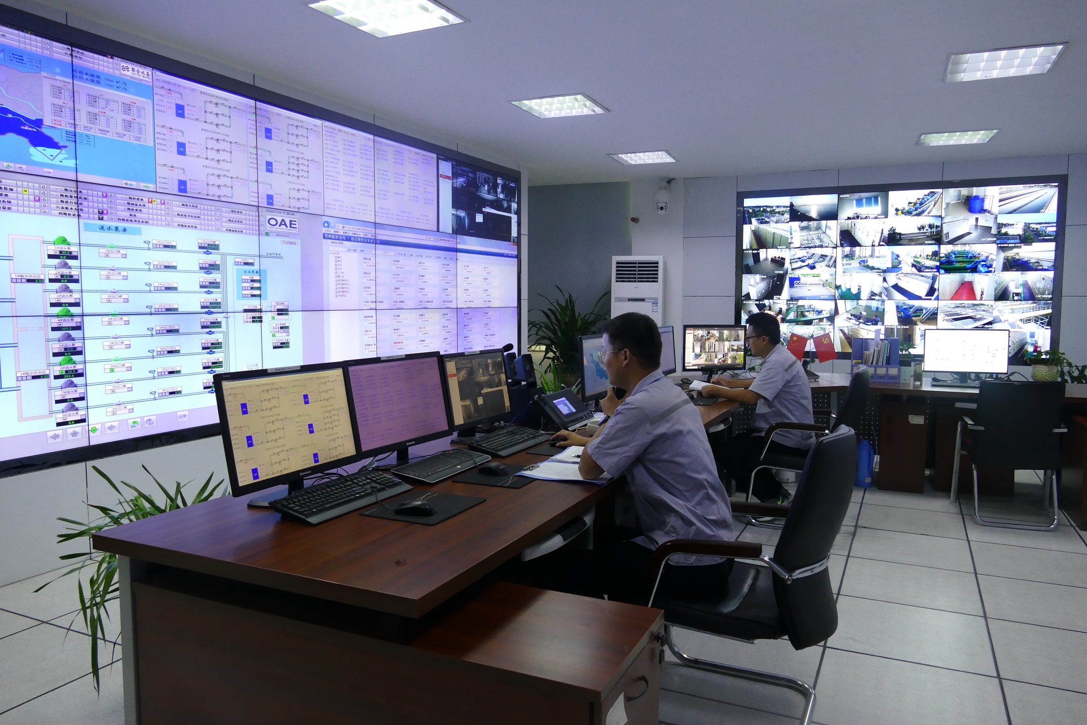 圖4:水檢人員做水質(zhì)化驗(yàn) 調(diào)度中心把好“供水科學(xué)調(diào)度”關(guān) 隨著供水規(guī)模的不斷擴(kuò)大,公司斥資一百多萬元對(duì)調(diào)度中心進(jìn)行了整裝重修,更換了液晶數(shù)字大屏,直觀、實(shí)時(shí)、全方位顯示各種信息,包括工藝控制、供水管網(wǎng)信息、二次供水信息、視頻監(jiān)控等。調(diào)度中心實(shí)行24小時(shí)人員值守,充分發(fā)揮供水“大腦中樞”的重要作用。供水調(diào)度人員,每天都要時(shí)刻關(guān)注著電腦和電子大屏上的數(shù)據(jù)參數(shù),一旦發(fā)現(xiàn)異常,立即匯報(bào)?雌聊痪昧耍劬ι鷿,疼痛難忍,但是,因?yàn)樾闹杏胸?zé)任,他們心無旁騖,堅(jiān)守崗位,確保每一滴水的科學(xué)優(yōu)化分配。