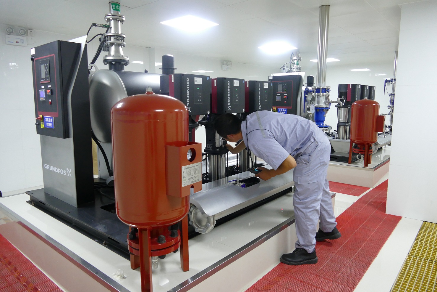 圖2:生產(chǎn)人員巡檢 機(jī)電設(shè)備部把好“設(shè)備安全”關(guān) 每年的高峰供水來臨前,宿遷銀控自來水有限公司都會(huì)制定詳實(shí)的設(shè)備保養(yǎng)、維護(hù)、改造計(jì)劃,確保各項(xiàng)設(shè)備運(yùn)行狀況良好,同時(shí)要求,在高峰供水期間,每日要對(duì)機(jī)組進(jìn)行加密巡檢,特別是對(duì)易產(chǎn)生高溫運(yùn)轉(zhuǎn)的設(shè)備進(jìn)行專項(xiàng)養(yǎng)護(hù)。目前該公司需檢測(cè)、檢修的主要、重要設(shè)備遍布于兩個(gè)水廠、7座泵站共1257臺(tái),工作人員根據(jù)片區(qū),不間斷進(jìn)行巡查。除了點(diǎn)巡檢,機(jī)電設(shè)備部所有人員排班進(jìn)行夜間值班,保證24小時(shí)在廠,出現(xiàn)設(shè)備問題立即解決,保障生產(chǎn)安全。