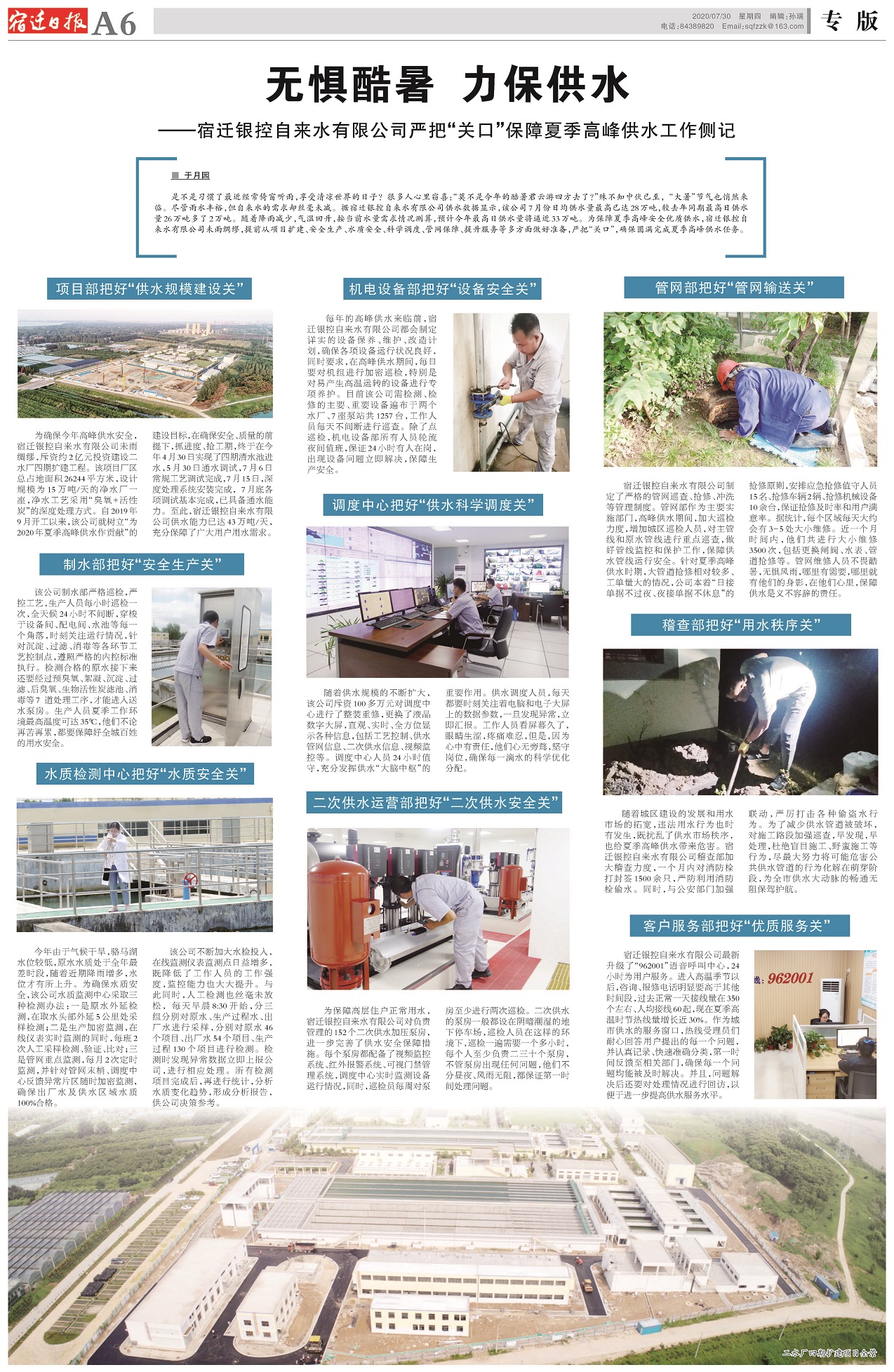 最近是不是習(xí)慣了倚窗聽雨,享受清涼世界的日子?很多人心里竊喜:“莫不是今年的酷暑君云游四方去了?”熟不知三伏天已悄然來臨, “大暑”節(jié)氣也已登上夏日舞臺(tái)。燒烤模式正式拉開帷幕。古詩(shī)云,“赤日滿天地,火云成山岳。草木盡焦卷,川澤皆竭涸。入伏之后的熱是不分古今的。一輪輪降雨,天氣潮濕又悶熱,盡管雨水豐裕,但自來水的需求也絲毫未減。據(jù)宿遷銀控自來水有限公司供水?dāng)?shù)據(jù)顯示,7月份日均供水量最高已達(dá)28萬噸,較去年同期最高日供水量26萬噸,有10%左右的增長(zhǎng)。未來隨著降雨減少,氣溫回升,按當(dāng)前水量需求情況,預(yù)計(jì)今年最高日供水量將逼近33萬噸。為保障夏季高峰安全優(yōu)質(zhì)供水,宿遷銀控自來水有限公司未雨綢繆,提前從生產(chǎn)安全、水質(zhì)安全、科學(xué)調(diào)度、管網(wǎng)保障、提升服務(wù)、項(xiàng)目擴(kuò)建等多方面做足準(zhǔn)備,無懼酷暑,默默堅(jiān)守,擔(dān)負(fù)使命,嚴(yán)把關(guān)口,堅(jiān)決保證圓滿完成夏季高峰供水任務(wù)。 項(xiàng)目部把好“供水規(guī)模建設(shè)”關(guān) 為確保今年的高峰供水安全,宿遷銀控自來水有限公司未雨綢繆,斥資約2億元投資建設(shè)二水廠四期擴(kuò)建工程。該項(xiàng)目廠區(qū)總占地面積26244平方米,設(shè)計(jì)規(guī)模為15萬噸/天的凈水廠一座,凈水工藝采用“臭氧+活性炭”的深度處理方式。自2019年9月開工以來,公司就樹立“為2020年夏季高峰供水作貢獻(xiàn)”的建設(shè)目標(biāo),在確保安全、質(zhì)量的前提下,抓進(jìn)度、搶工期,終于在2020年4月30日實(shí)現(xiàn)了四期清水池進(jìn)水,5月30日通水調(diào)試,7月6日常規(guī)工藝調(diào)試完成,7月15日,深度處理系統(tǒng)安裝完成, 7月底各項(xiàng)調(diào)試基本完成,已具備通水能力。至此,宿遷銀控供水能力已達(dá)43萬噸/天,充分保障了廣大用戶用水需求。