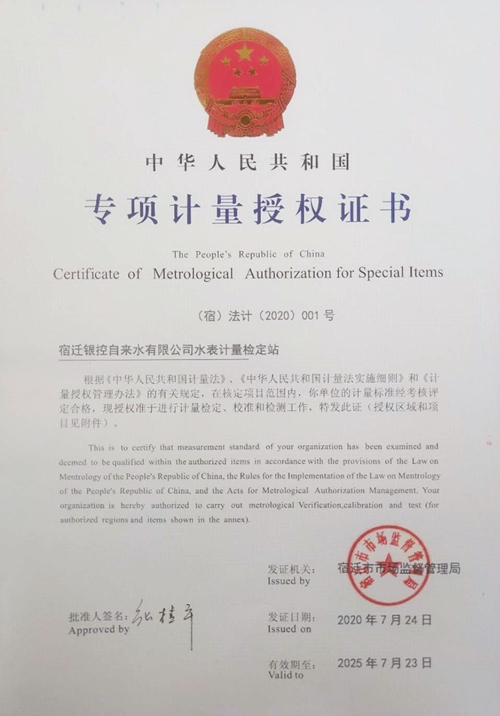 經(jīng)過現(xiàn)場嚴格考核,根據(jù)《中華人民共和國計量法》、《中華人民共和國計量法實施細則》、《計量授權管理辦法》的有關規(guī)定,考核組認為:宿遷銀控自來水公司水表計量檢定站,嚴格按照宿遷市市場監(jiān)督管理局要求開展水表計量檢定工作,全面履行《計量法》賦予的職責和義務,依法辦事,為政府行政計量部門實施計量監(jiān)督提供可靠的技術保證,圓滿通過現(xiàn)場考核。8月7日,檢定站取得中華人民共和國《專項計量授權證書》。更為欣喜的是,本次《專項計量授權證書》授權期限由往常的3年延長至5年,授權有效期至2025年7月23日。 |