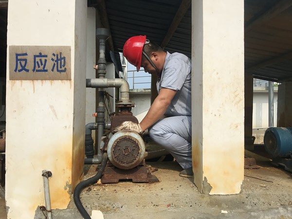 圖2:機(jī)電人員在檢修設(shè)備 用雙腳丈量熾熱的土地,確保生產(chǎn)安全 生產(chǎn)部水區(qū)運(yùn)行工24小時(shí)不間斷對(duì)廠內(nèi)各個(gè)工藝段污水指標(biāo)、設(shè)備進(jìn)行巡查。烈日炎炎,他們用雙腳丈量每一寸熾熱的土地,他們的身影不停穿梭在集水池、初沉池、水解酸化池、好氧池、二沉池、終沉池、芬頓池之間。盡管豆大的汗珠在臉上肆無忌憚的橫流,他們依堅(jiān)守在一線,一遍遍巡查,一旦發(fā)現(xiàn)問題,立即上報(bào)。 嚴(yán)控工藝,根據(jù)污水指標(biāo),嚴(yán)格進(jìn)行生產(chǎn)調(diào)控。根據(jù)進(jìn)水情況,調(diào)整前物化段加藥量;根據(jù)溶解氧量,調(diào)整鼓風(fēng)機(jī)出風(fēng)量;根據(jù)終沉池出水水質(zhì),調(diào)整芬頓加藥量。正是因?yàn)閲?yán)謹(jǐn)?shù)墓ぷ髯黠L(fēng)及對(duì)工藝的嚴(yán)格調(diào)控,才保證了荊州項(xiàng)目公司出水始終達(dá)標(biāo)排放。