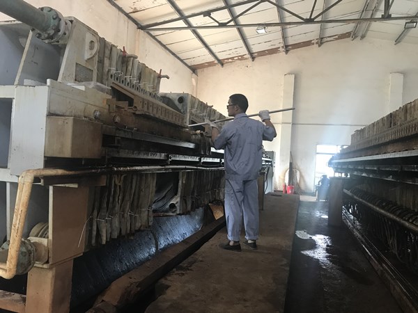 圖3:生產(chǎn)部水區(qū)運(yùn)行工正在巡查設(shè)備 赤膊上陣, “桑拿房”竭盡全力壓泥卸料 荊州項(xiàng)目公司是工業(yè)廢水綜合污水處理廠,因工業(yè)廢水水質(zhì)雜,以致進(jìn)入污水處理系統(tǒng)后產(chǎn)生的污泥成分復(fù)雜,污泥量大。系統(tǒng)產(chǎn)生的污泥經(jīng)過調(diào)理罐加藥調(diào)理絮凝、低高壓螺桿泵進(jìn)料、板框壓濾機(jī)壓榨、卸料這一系列程序后才能拖運(yùn)至污泥焚燒單位進(jìn)行后續(xù)處置。為了保證后續(xù)工作正常開展,泥區(qū)運(yùn)行工需做到當(dāng)日泥當(dāng)日清。 污泥脫水間在太陽炙烤下儼然就是溫度高達(dá)40℃的“桑拿房”,泥區(qū)運(yùn)行工需要在充滿窒息氣味的“桑拿房”內(nèi)竭盡全力壓泥卸料,由于工作服被汗水濕透,貼于身體施展不開,不得不赤膊上陣。面對(duì)這嚴(yán)酷的“烤”驗(yàn),他們無懼無畏、奮勇向前、迎難而上。