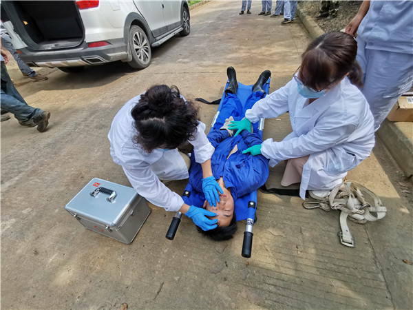 圖2:應(yīng)急演練現(xiàn)場--醫(yī)護人員查看傷員情況 總指揮迅即趕到事故地點統(tǒng)籌指揮,應(yīng)急小組多措并舉,疏散現(xiàn)場閑雜人員、布置警戒線、通知救援小組展開救護工作、撥打120急救電話,各項工作緊張而有序開展。救援隊長了解事故大致情況后,安排人員在現(xiàn)場安裝大功率通風(fēng)設(shè)備進行通風(fēng)處理,并開展初期救援,2分鐘后,公司專業(yè)救援人員佩戴便攜式防毒面具、安全帶,攜帶檢測儀器、對講機,連接救生索,入池檢測氣體濃度,評估下池救援的可行性。在確認可以施救的情況下,將傷員轉(zhuǎn)移至池外通風(fēng)空曠處,隨即按標(biāo)準心肺復(fù)蘇手法實施搶救,直至120救護車趕到。專業(yè)醫(yī)護人員查看傷員情況后將其轉(zhuǎn)移至救護車上,送往醫(yī)院搶救治療。至此,經(jīng)過精心策劃、周密安排的應(yīng)急演練圓滿落下帷幕。