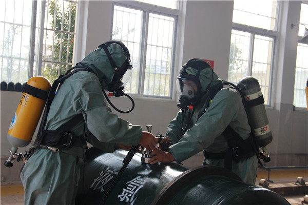 圖:氯氣泄漏演練現(xiàn)場(chǎng) 隨著一陣警鈴聲響起,液氯泄漏應(yīng)急演練活動(dòng)正式開始。水廠值班人員發(fā)現(xiàn)加氯間內(nèi)有煙霧彌漫,在確定是氯氣泄漏后,水廠負(fù)責(zé)人立即向分管生產(chǎn)領(lǐng)導(dǎo)付總匯報(bào),并拉好警戒線迅速疏散職工撤離到安全地帶。在付總的指示下,立即啟動(dòng)《王英水廠氯氣泄漏預(yù)案》指令,搶修組成員在穿戴防化服和正壓式空氣呼吸器進(jìn)入氯庫(kù)進(jìn)行查漏處置,對(duì)泄漏儲(chǔ)罐進(jìn)行泄壓、堵漏、倒罐,經(jīng)過(guò)3分鐘左右的緊急有序搶修,氯氣泄漏事故得到妥善處理。
