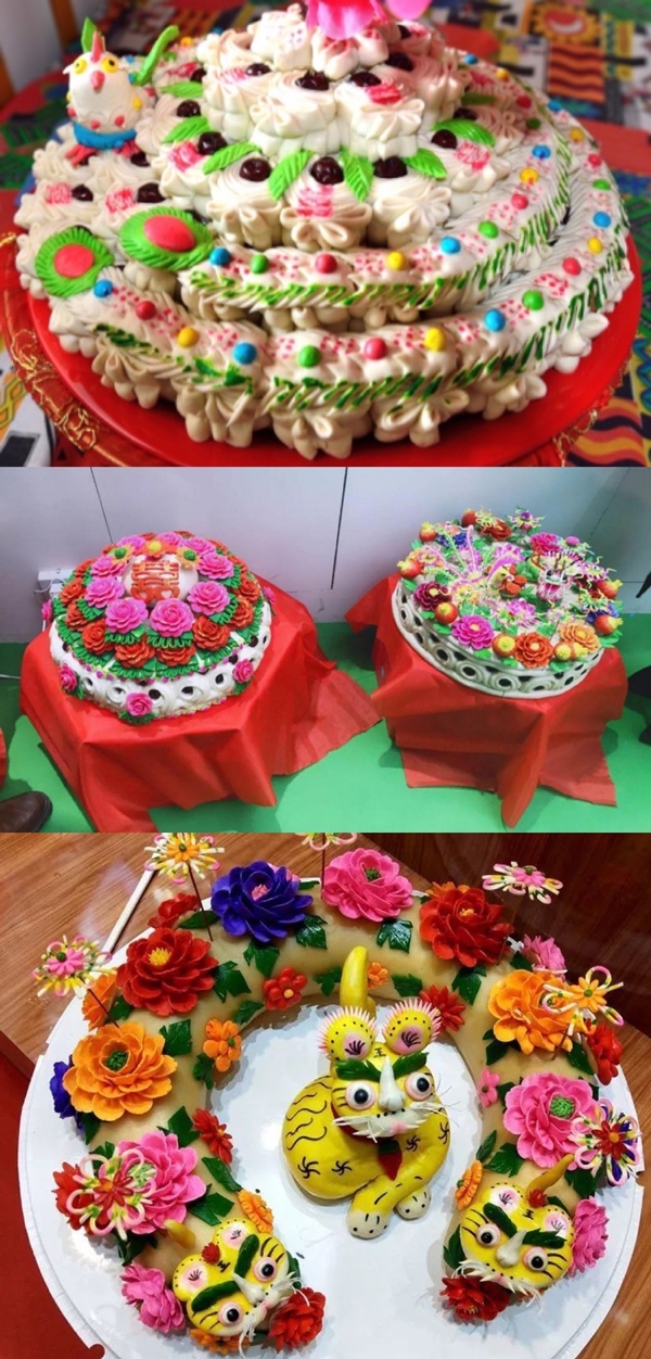 古絳州,今天的新絳縣,一直是山西省重要的小麥、棉花產(chǎn)地。麥?zhǔn)諘r節(jié),家家戶戶收麥、晾曬,用上等的小麥磨成面粉。每逢年歲時節(jié)、絳州民間面塑形態(tài)各異、花色絢麗,又被當(dāng)?shù)厝朔Q為“花饃”。因民俗而出現(xiàn)的面塑則代代相傳、生生不息,經(jīng)過幾千年的傳承和經(jīng)營,成為中國傳統(tǒng)文化和民間藝術(shù)的一部分。春節(jié),講究“大門獅子二門狗”,寓意鎮(zhèn)宅保平安;水缸旁放“雙頭魚”,寓意連年有余;糧倉放牛拉車和麥囤,寓意糧倉滿溢、日子越過越景氣;天地爺處祭棗山花饃、豬羊饃、節(jié)節(jié)高饃,寓意殺豬宰羊、生活一年比一年好;財神爺處祭元寶棗籃饃,寓意招財進(jìn)寶。清明時節(jié),要捏豬頭饃、刺魚饃等祭祖掃墓,刺饃還得在墳頭滾一滾,意為已故祖先撓癢癢,盡兒孫之孝。端午節(jié),要捏老虎饃,“虎鎮(zhèn)五毒”,寓意去災(zāi)辟邪。婚禮上,要捏龍鳳糕,插柏葉,紅繩系核桃、紅棗、花生、石榴、寓意夫妻百年好合、發(fā)家致富、生兒育女。新生兒滿月時,要蒸各式各樣的花、果造型的花饃、寓意開花結(jié)果。壽誕時、兒女要為長輩蒸壽桃饃。為母親拜壽時,插一組“七仙女拜壽”,為父親拜壽時,插一組“八仙慶壽”,顯示兒女孝心。在這片土地上,自漢代以來流傳千年的捏花饃風(fēng)俗,早已深深融入絳州人們生活的方方面面。只要有誰家遇上紅白事,鄰居、親戚都會聚集在一起幫忙蒸制花饃。
