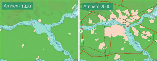 備注:圖片來源于網絡 奈梅亨(Nijmegen)退堤工程位置位于瓦爾河(Waal River),是河流從德國至荷蘭境內后的關鍵節(jié)點,敏感性極高,城市發(fā)展不斷擠壓河道生存空間,加劇了洪水與城市之間的緊張關系。