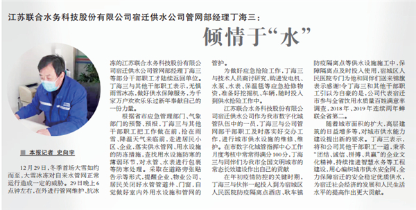 恰逢陽歷新年前夕,大戰(zhàn)寒潮之時,宿遷供水公司管網(wǎng)部經(jīng)理丁海三被《宿遷日報》專版約訪并報道,這是一份屬于聯(lián)合水務(wù)供水人的榮耀。