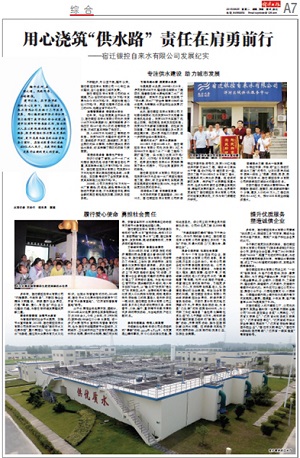 建市以來(lái),在市委市政府的關(guān)心支持下,宿遷銀控自來(lái)水有限公司歷經(jīng)十二年改革發(fā)展,用心編織城市供水安全網(wǎng),有力保障了我市供水安全優(yōu)質(zhì)。值建市20周年即將來(lái)臨之際,宿遷供水人在以更飽滿(mǎn)的熱情、更優(yōu)質(zhì)的服務(wù),投身到宿遷供水事業(yè)發(fā)展的同時(shí),更不忘肩頭擔(dān)負(fù)的社會(huì)責(zé)任,奮力前行,在宿遷投資供水設(shè)施近8億元人民幣,為我市的高速發(fā)展做出新的更大的貢獻(xiàn)。