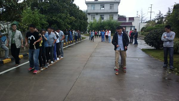 9月30日下午,舉辦的是“無軌列車”活動。該項(xiàng)團(tuán)體活動要求每組4男4女搭配,各組組員的兩腳必須分站在由兩塊木板制成的行走板上,協(xié)調(diào)一致前行,在比賽過程中任意隊(duì)員任意部位與地面有接觸,即被警告1次,同時在總成績上增加10秒,警告3次取消比賽資格。賽道全長50米,含下坡路段,成績匯總后,以完成比賽用時最短的一組獲勝。最終,行政財(cái)務(wù)聯(lián)隊(duì)以1分48秒的成績獲得第一,工程聯(lián)隊(duì)獲得第二,洋河聯(lián)隊(duì)、污水客服聯(lián)隊(duì)并列第三。